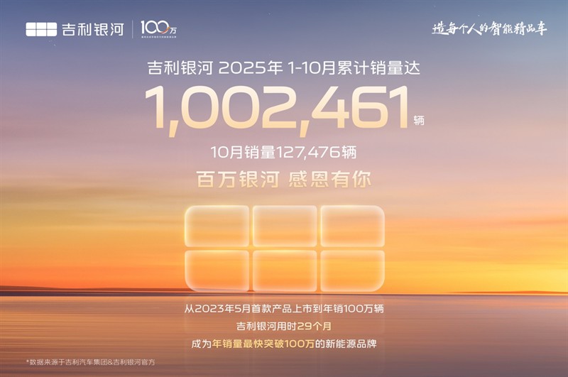 值得一提的是,截止今年10月,2025年吉利银河年度累计销量已突破100万辆,达到1002461辆。自2023年5月吉利银河L7发布以来,吉利银河仅历时29个月,便实现年销百万,成为最快达成年销百万的新能源汽车品牌。吉利银河在每一个细分市场中,都为用户提供高质优价、超越期待的好产品,创造出了举世瞩目的“银河速度”,交出了一份年销百万、速度第一、中国唯二、全球前三的满意答卷,再度树立了全新销量里程碑。